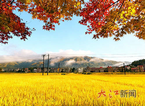金秋时节的永新县澧田镇,稻田铺就金色绒毯,远山如黛云雾缭绕,红瓦村舍点缀其间,在光影下呈现出油画般的质感。金飞飞摄(金飞飞)